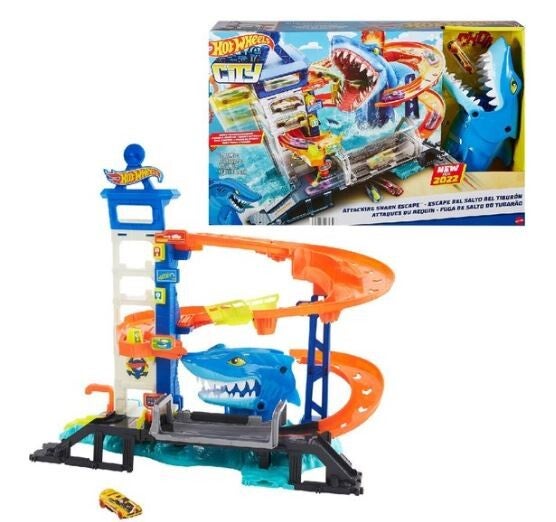- Er ligt een enorme haai op de loer onder de Hot Wheels City parkeergarage die nietsvermoedende voertuigen aanvalt en verslindt. Vang de haai en bevrijd je vrienden!