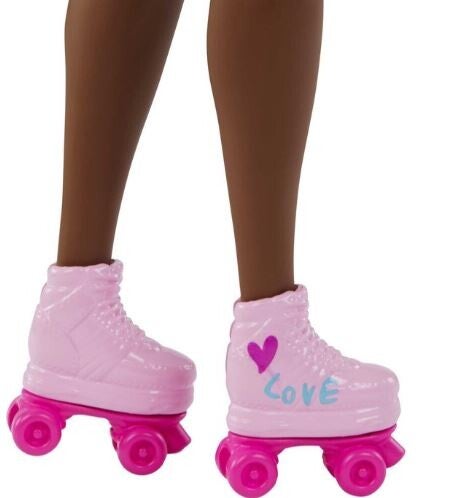 Barbie draagt een blouse met ruches die de schouders bloot laat en sportieve, pastelkleurige shorts. Haar krullende zwarte haar draagt ze in een prachtig afrokapsel en ze heeft schattige roze rolschaatsen aan haar voeten!